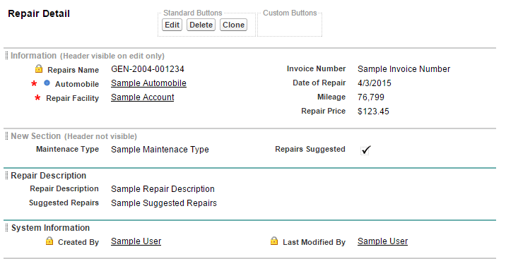 Lifetime Repair Costs | Roll-Up Summary (SUM Repair) | The roll-up summary field will calculate the sum of the related repair records. |