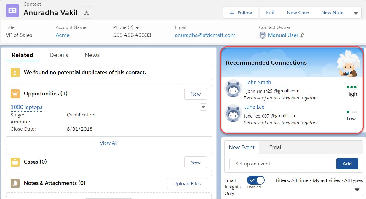 The Winter '19 release brought an interesting Einstein functionality called Recommended Actions which shows important connections within their networks (aka fellow Salesforce users). Einstein will show how many interactions another user has had with a Lead or Contact so that you can determine if working with this person would make sense to manage the relationship or close the deal.