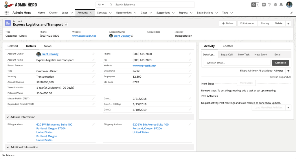 Just like any website, Salesforce contains hyperlinks. These links can be used to navigate through Salesforce in a variety of ways. Notice that in the screenshot below, my name displays as a hyperlink. Remember when we talked about relational databases in the first Zero to Hero post? This is what a relational database looks like.